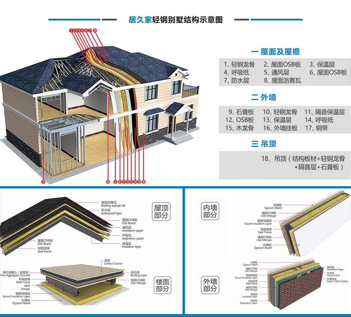 居久家輕鋼別墅隸屬于四川萬建城建筑工程有限公司,集科研、設計、咨詢、加工、生產安裝為一體。一直致力于新型輕鋼結構房屋的研究、開發(fā)和應用,倡導房屋建筑的設計和應用在標準化、模塊化、通用化、規(guī)模化生產的同時,實現人居環(huán)境的個性化、人性化、以及健康和舒適。 公司目前引進具有國內先進水平輕鋼結構房屋建筑技術和生產線,標準化、精細化和定制化設計、制造、安裝輕鋼結構房屋。不僅能夠提供風格各異的別墅建筑,同樣能夠提供行業標準的輕鋼樓宇建筑及建筑群。居久家裝配式房屋技術體系是高效節(jié)能型綠色建筑體系,各項建筑物理性能卓越,處于業內先進水平,能夠為客戶提供全程模塊化綠色建筑集成解決方案。